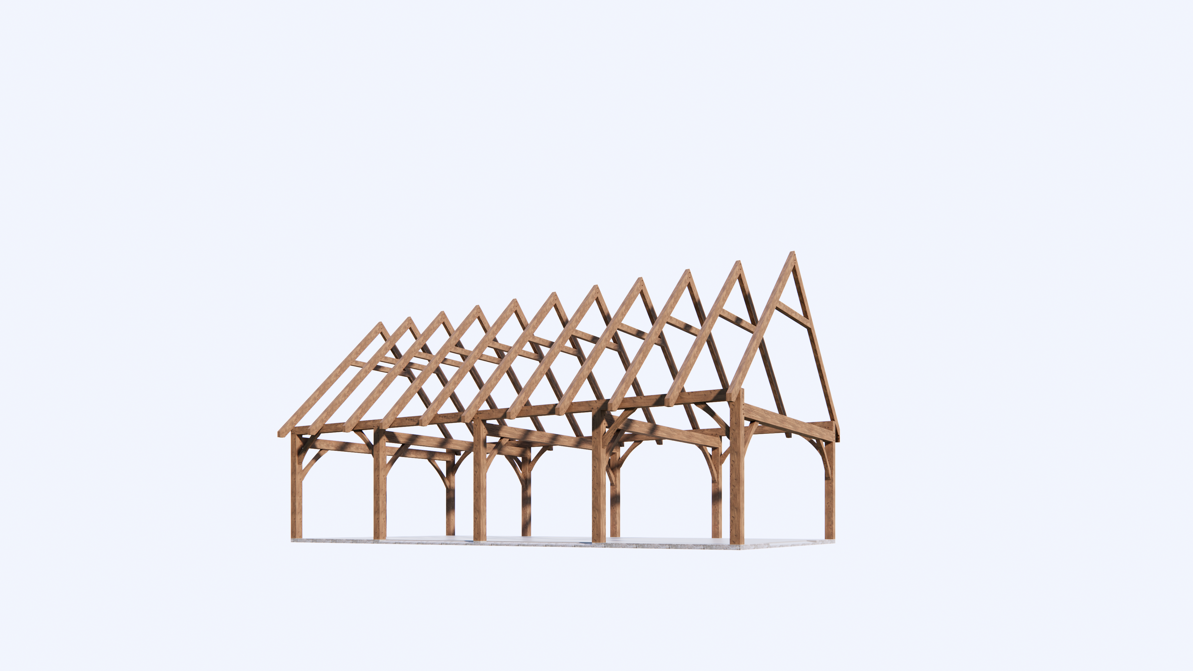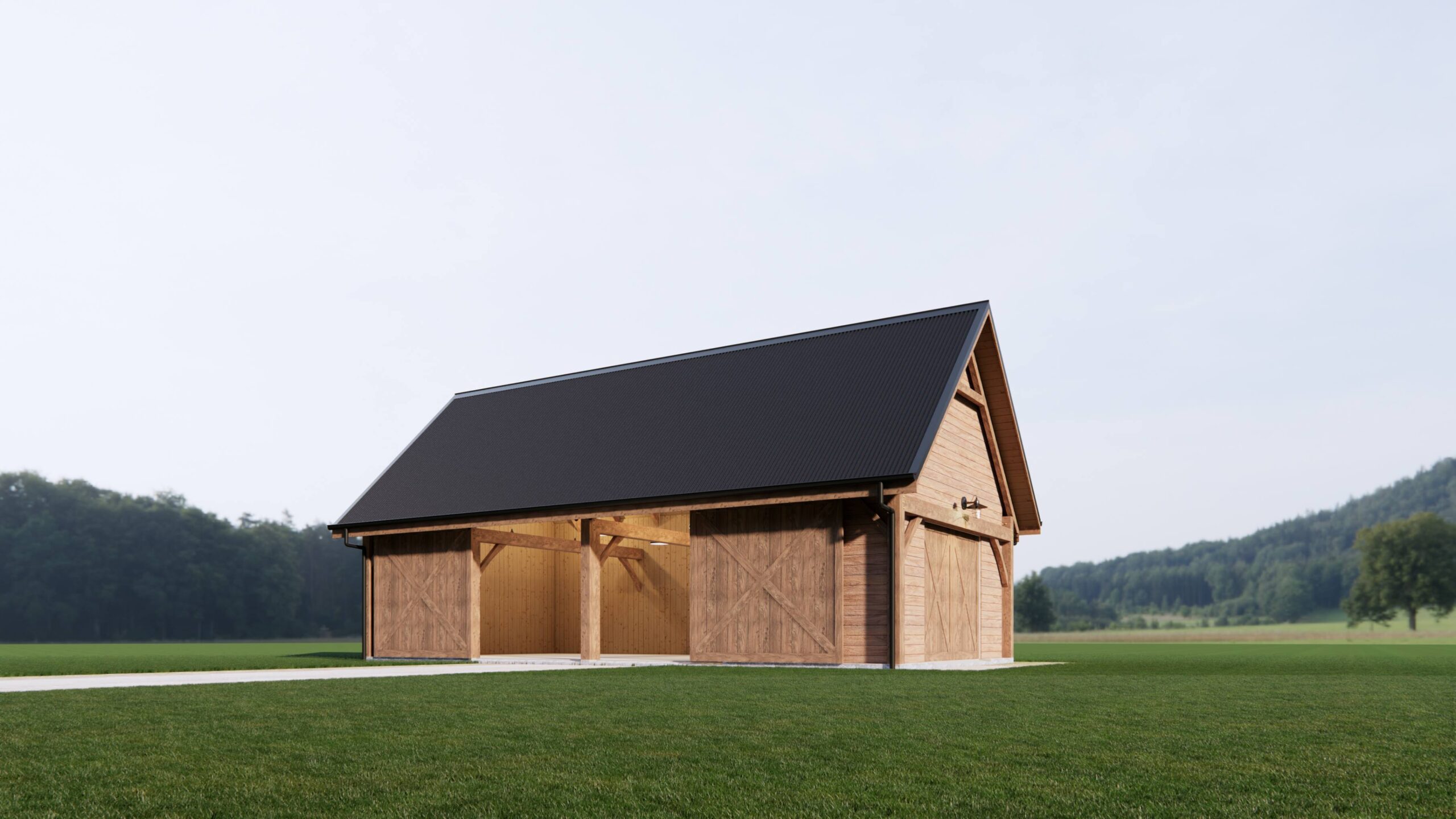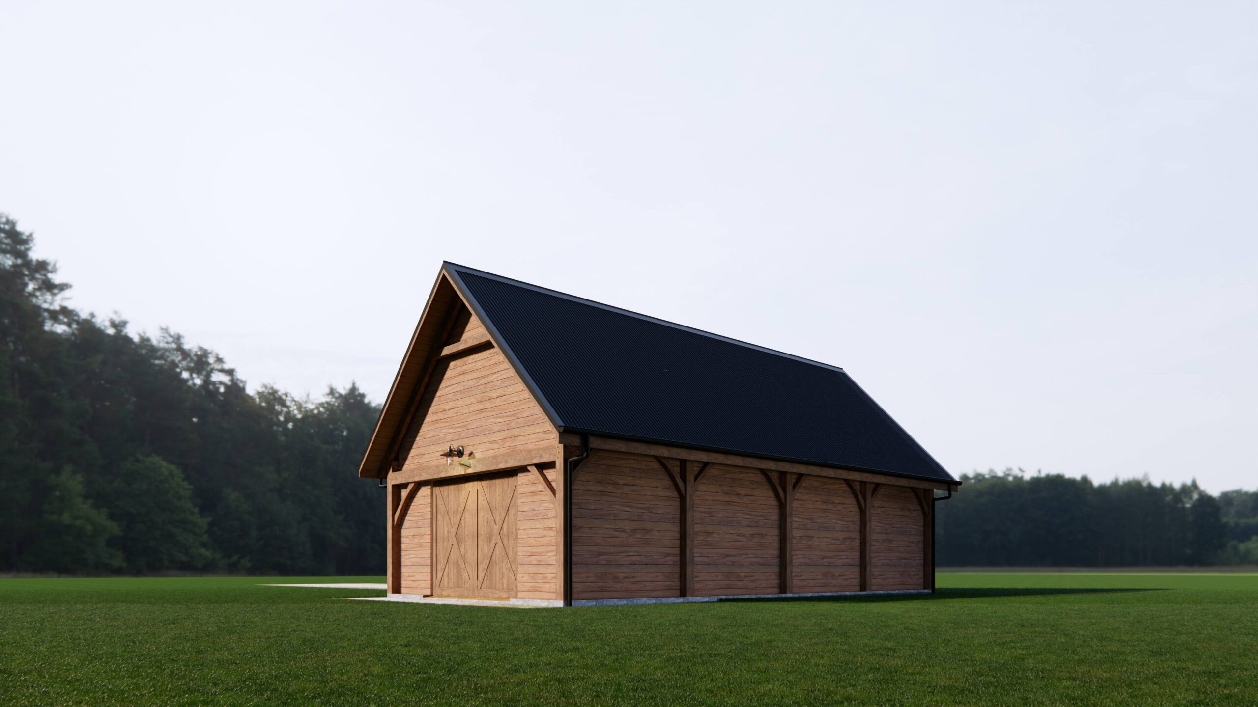 Our Garage Barn Frame is 6m wide with bays from 3m to 4.6m. Our frames are typically 2 or 3 bays but these can be added as desired. The design has a steeper roof pitch and either ridge and rafter system or collar tie trusses to provide a useful loft space above which is ideal for storage or for a studio. The frame is made from heart Macrocarpa so that it can handle the elements and has horizontal girts so that the cladding can be directly fixed to the barn frame. If you would like to future proof your garage barn then we can design it to have Metal Insulated Panels direct fixed which will meet H1 insulation requirements should you wish to convert it into a dwelling later.