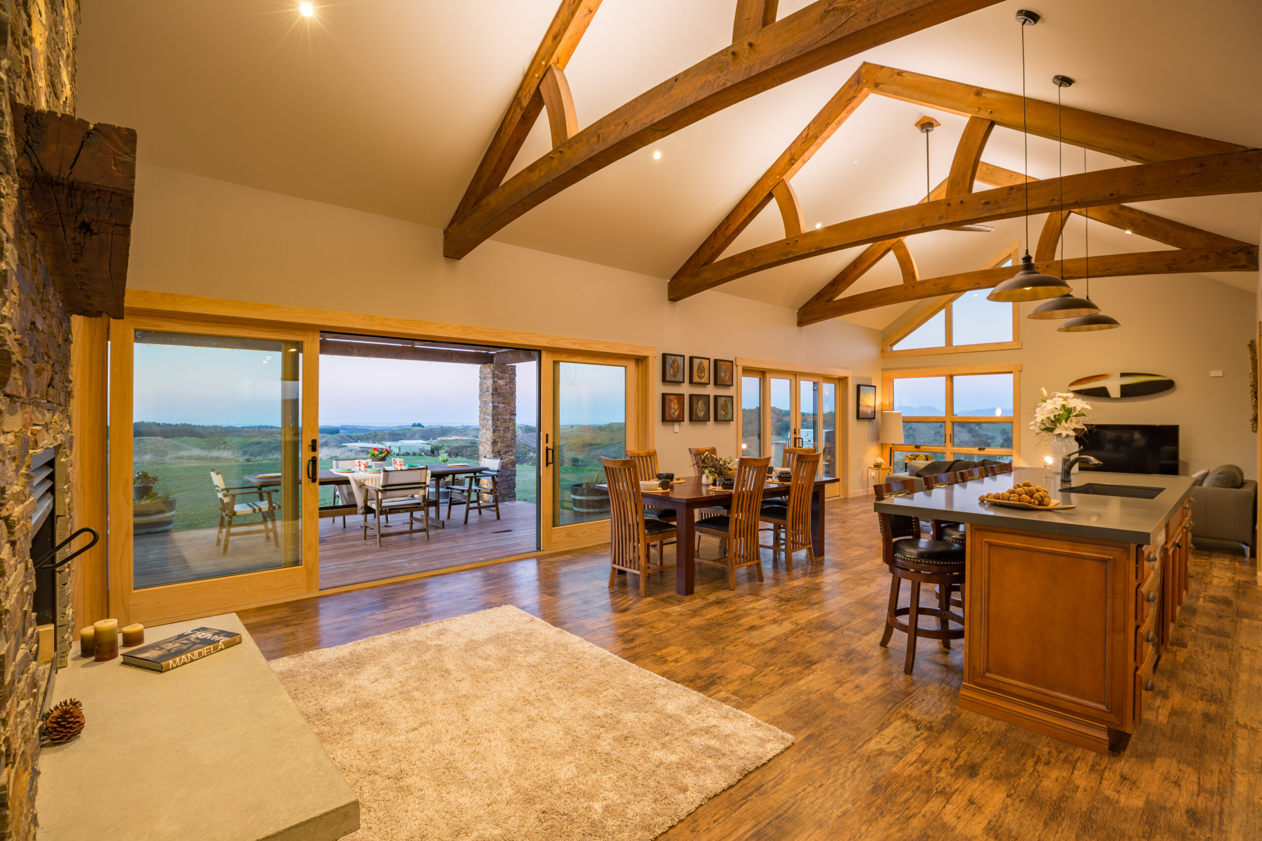 We have developed a range of structural roof trusses made from New Zealand grown hardwood that add unparalleled strength and beauty to any design. We realise that people do not always want a full timber frame but often desire solid timber features in their home to create atmosphere and set it apart. Our engineered trusses create an attractive open plan space with vaulted ceilings, whilst adding the texture and warmth of solid timber. Incorporating our structural roof trusses can transform your home or outdoor living space.
